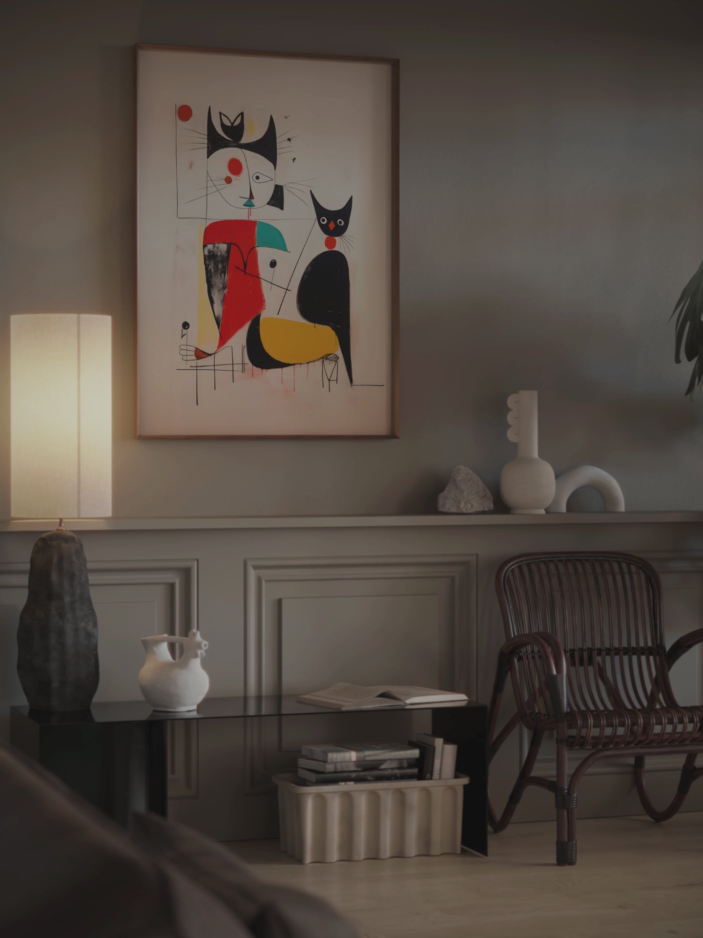 - Inspiriert vom Genie Joan Miró strahlt der Druck Wärme und Eleganz aus, die sowohl bei Katzenliebhabern als auch bei Kunstliebhabern Anklang finden.