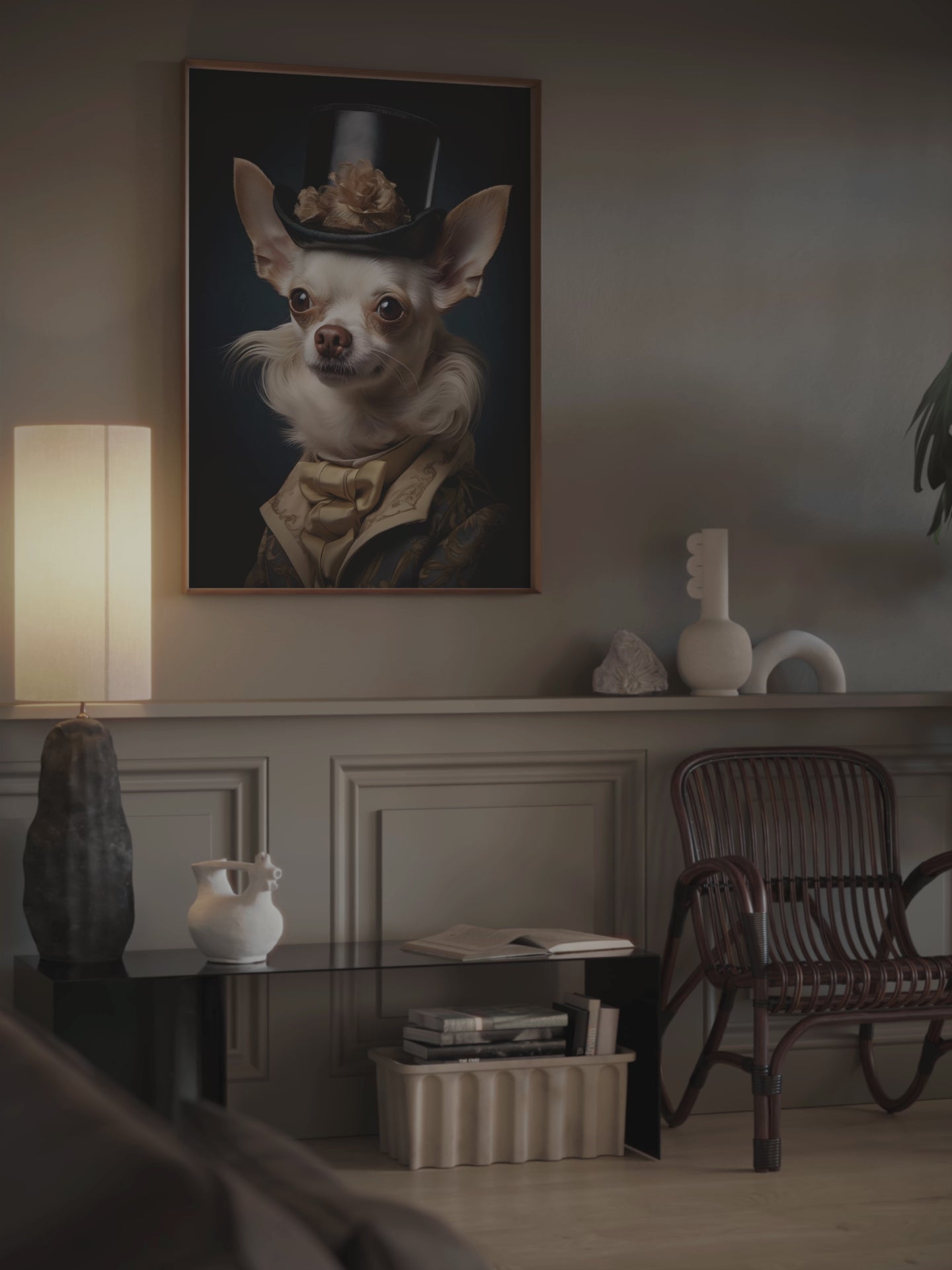 This cute artwork combines adorable Chihuahuas with the elegance of Victorian fashion. Each character showcases their own distinct personality, from the mischievous mischief-maker to the regal and refined companion.