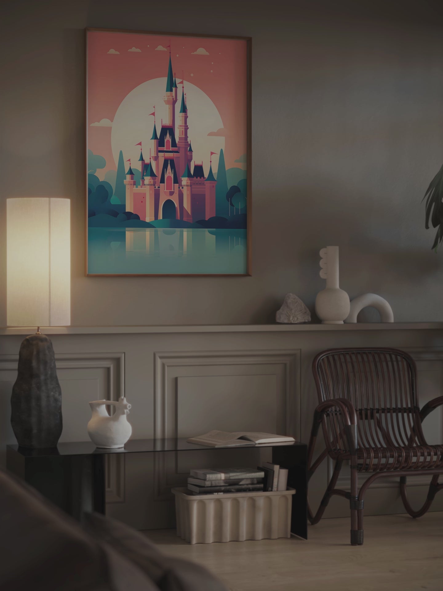 Experience the magic of the Disney castle with our stunning print, available in a variety of sizes and frame options or as a canvas. Its charming flat design captures the enchantment of the castle and evokes nostalgic feelings for both adults and kids. The perfect gift for any Disney fan!