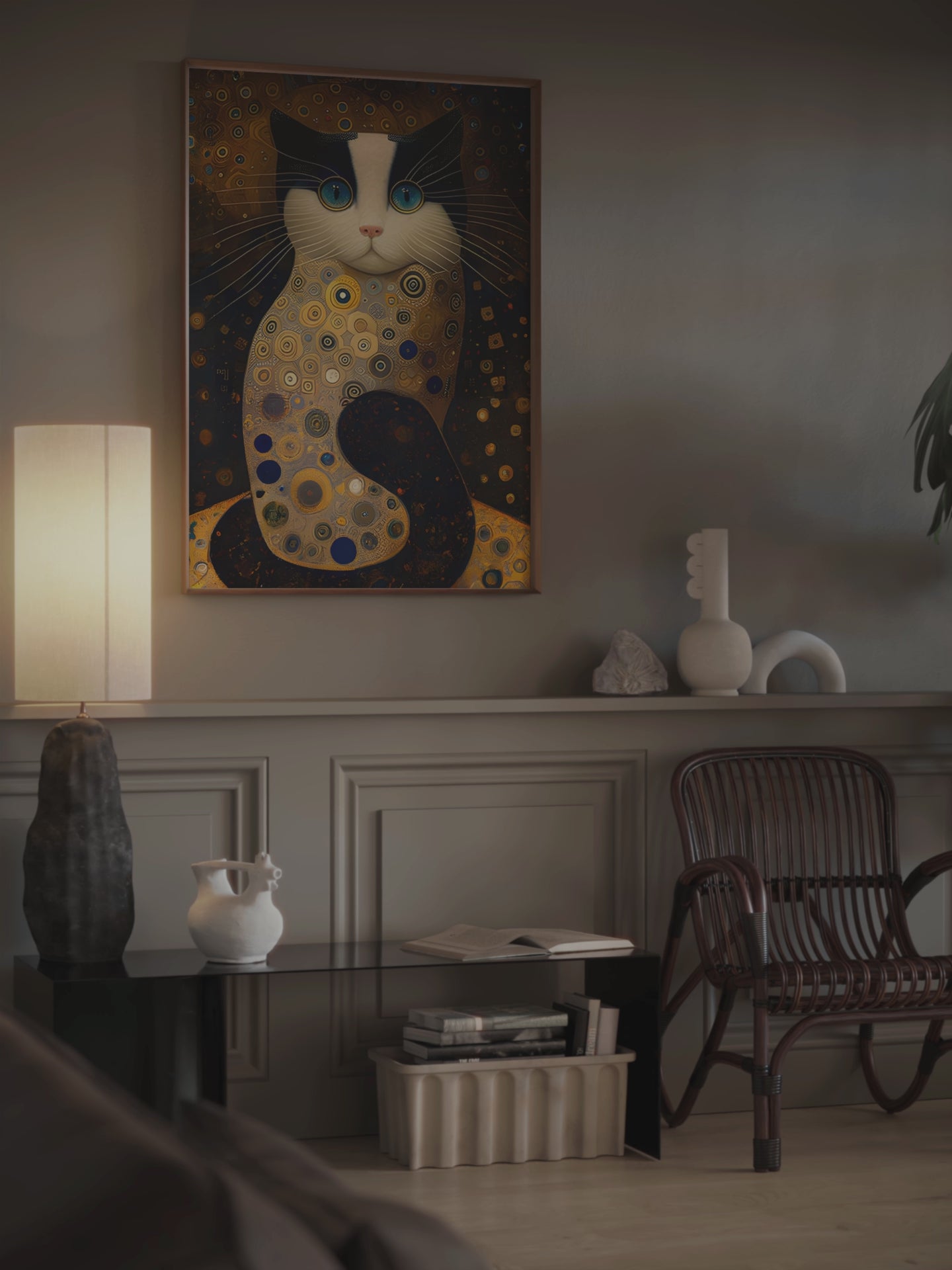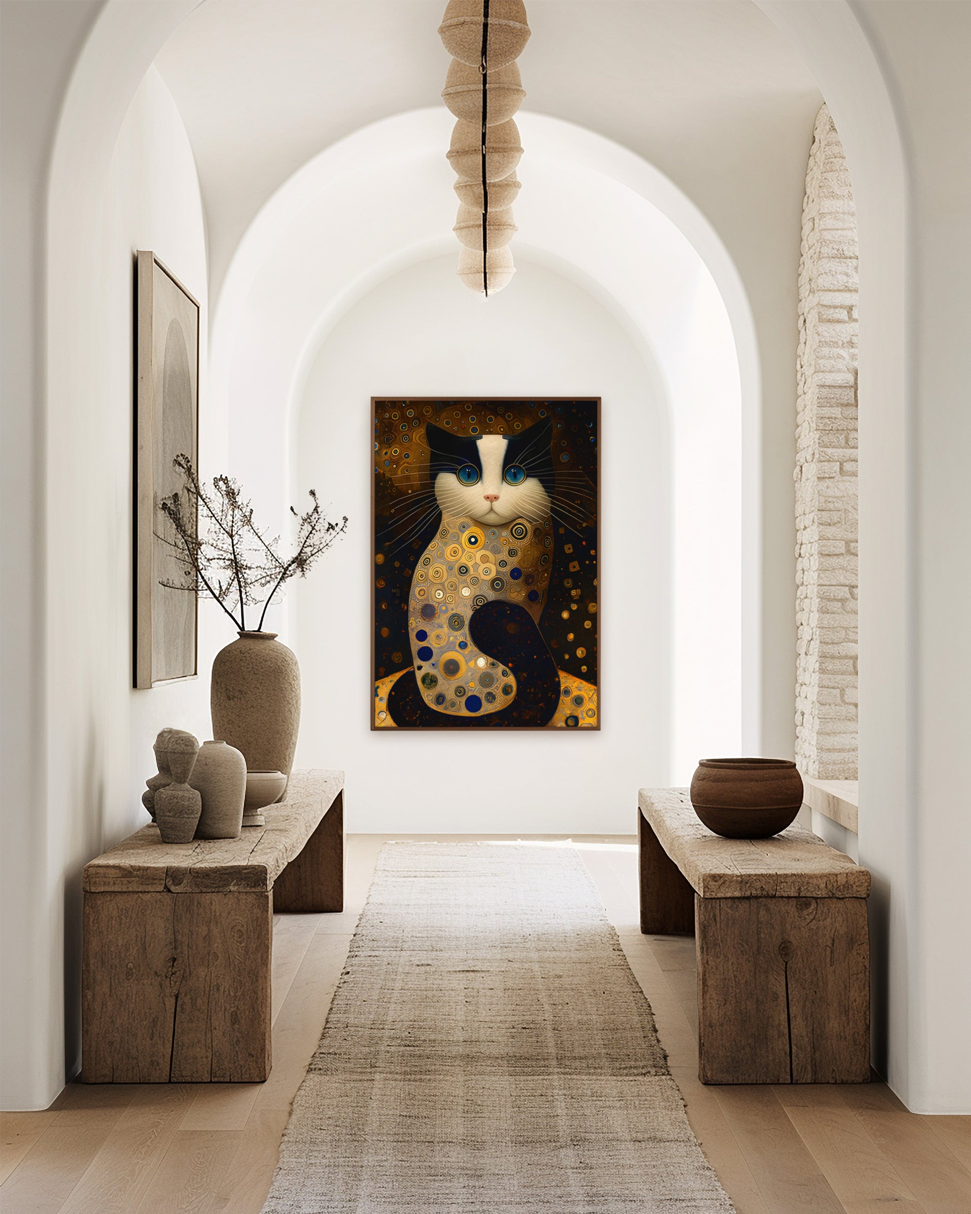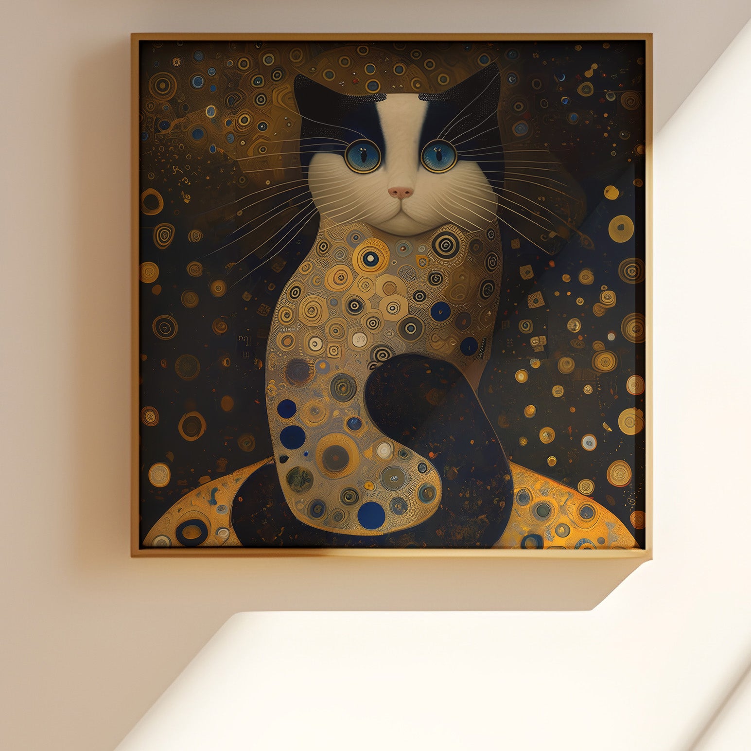 This stunning cat portrait, inspired by the golden style of Gustav Klimt, is one-of-a-kind art piece that captures the unique beauty and personality of your feline companion in a timeless and sophisticated style.