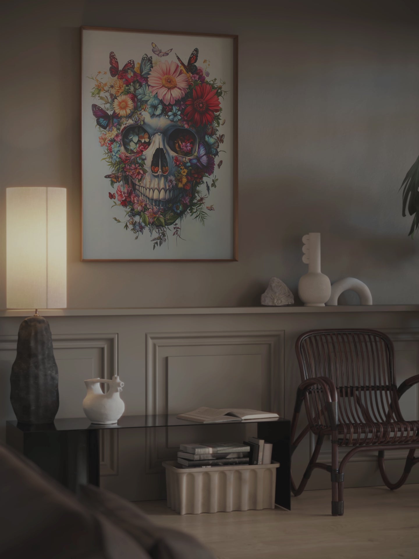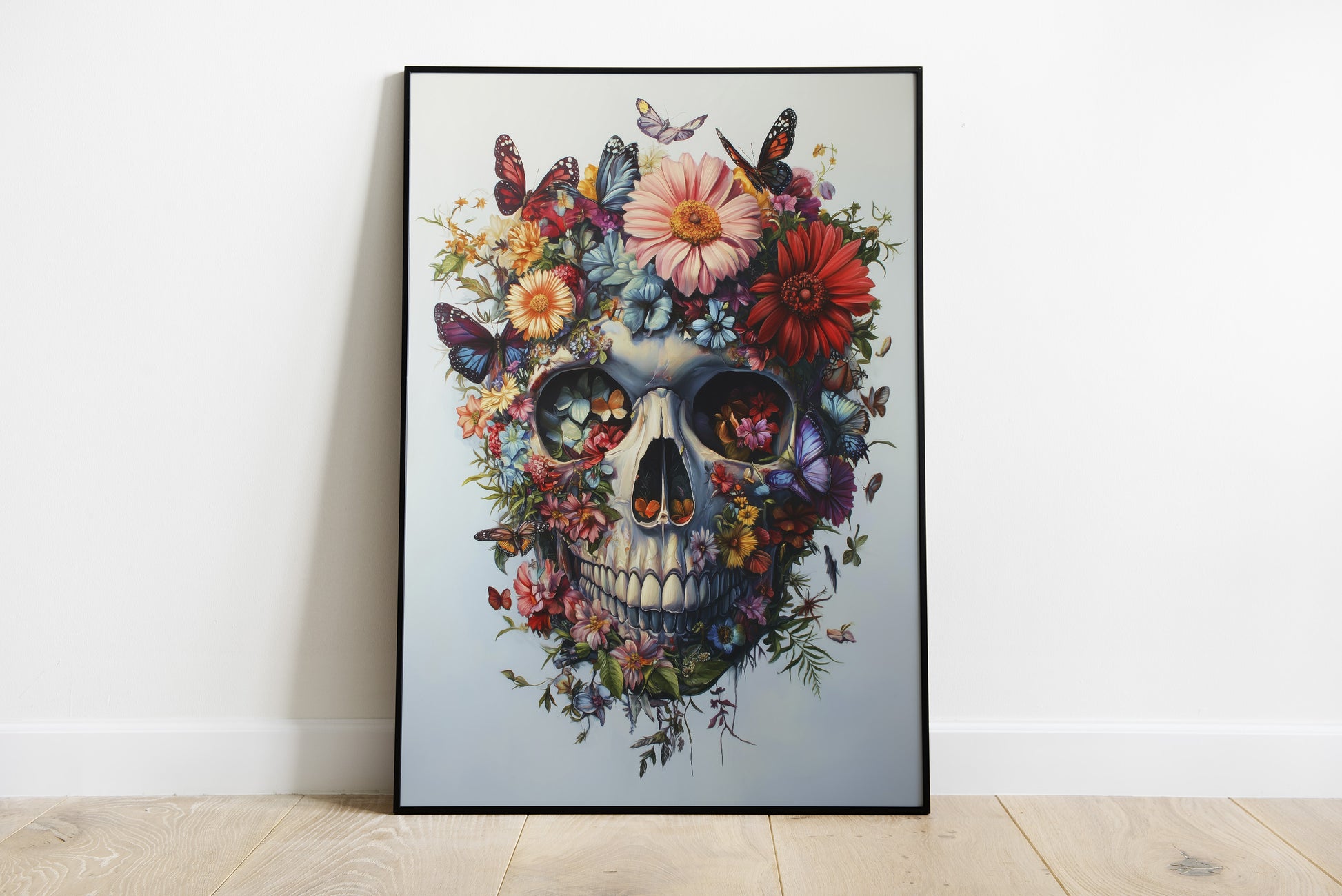 Add a captivating statement piece to your home with this Art Print featuring a skull filled with colorful flowers and butterflies. Transform your walls with this eye-catching fusion of life and decay.