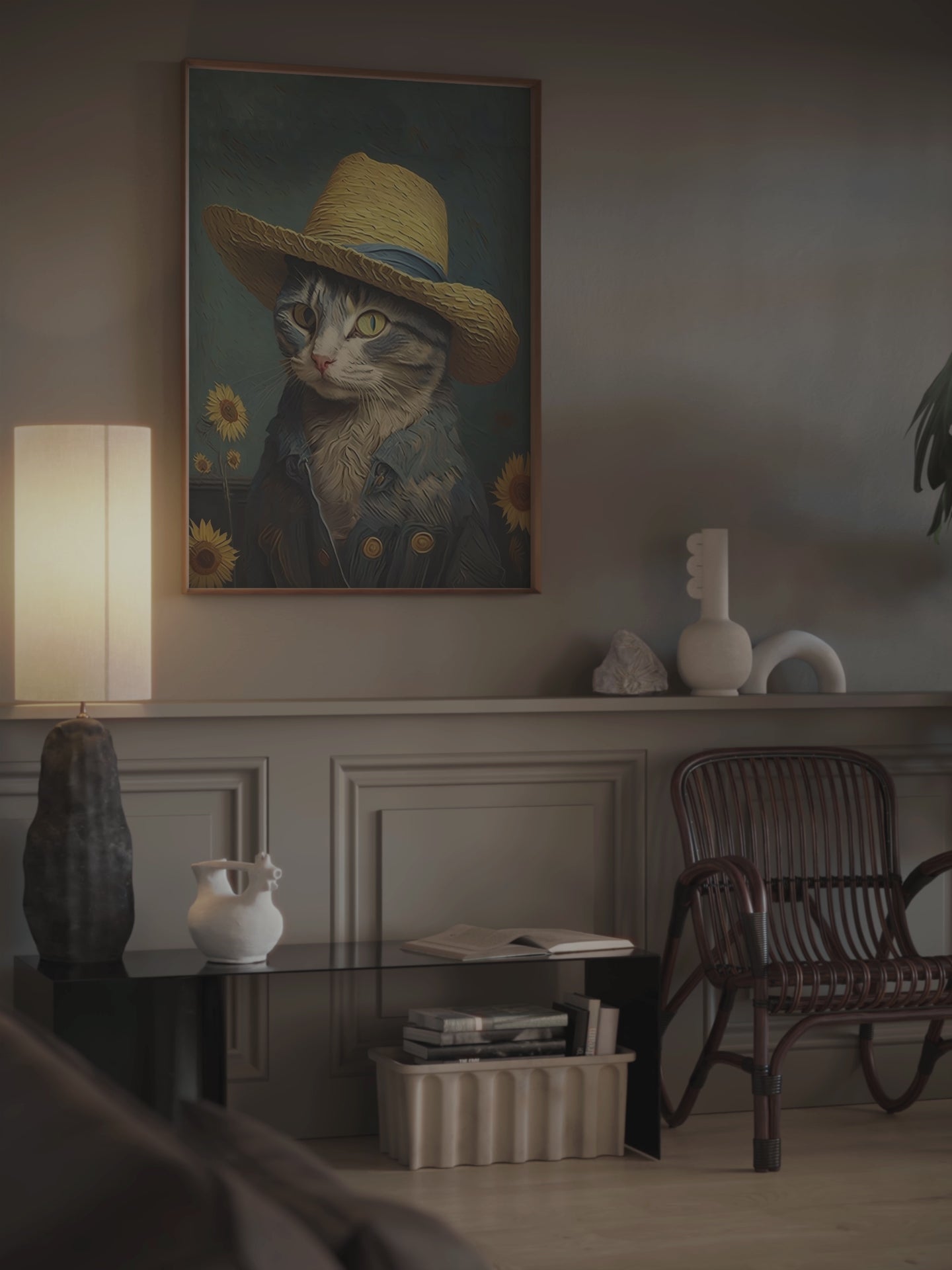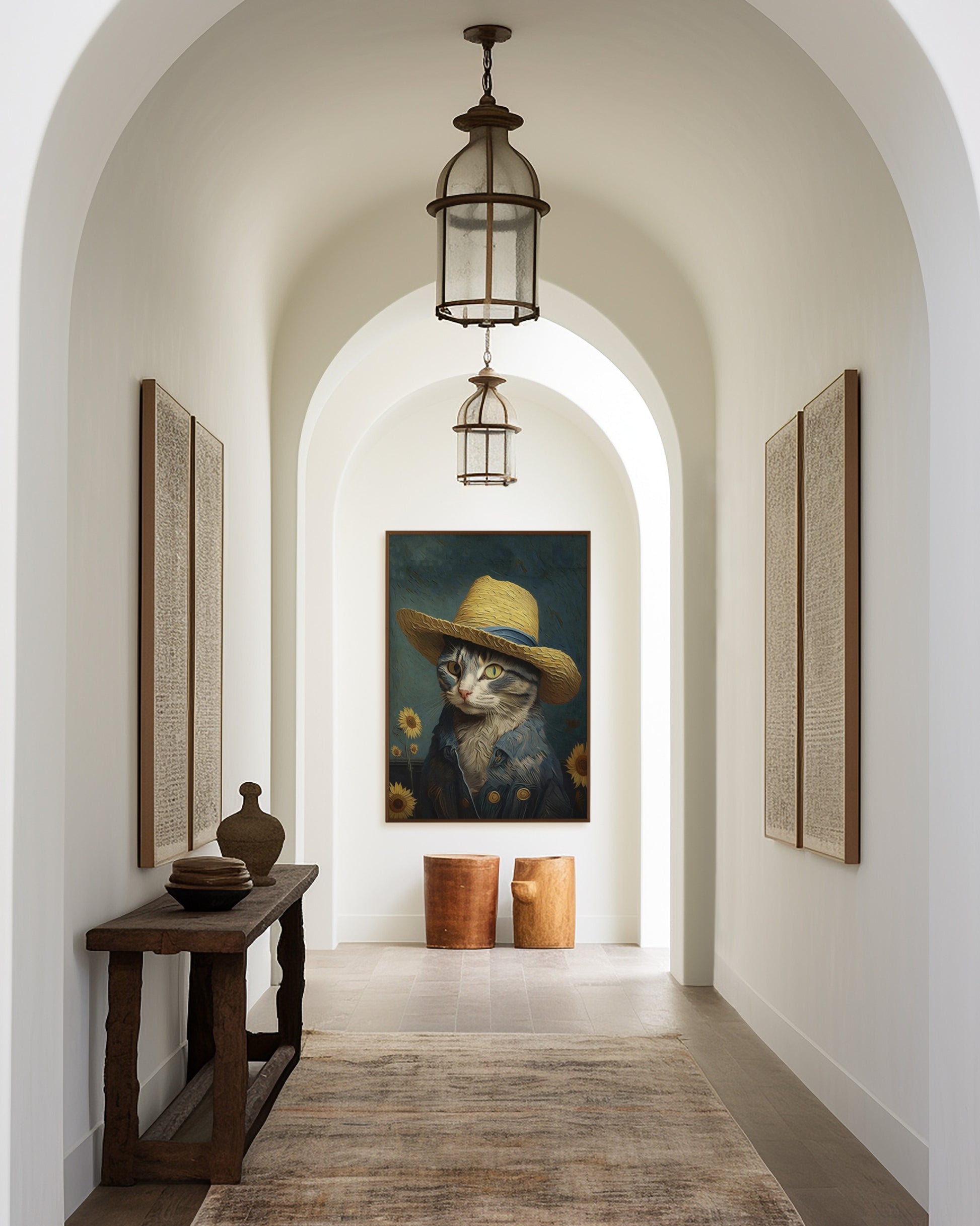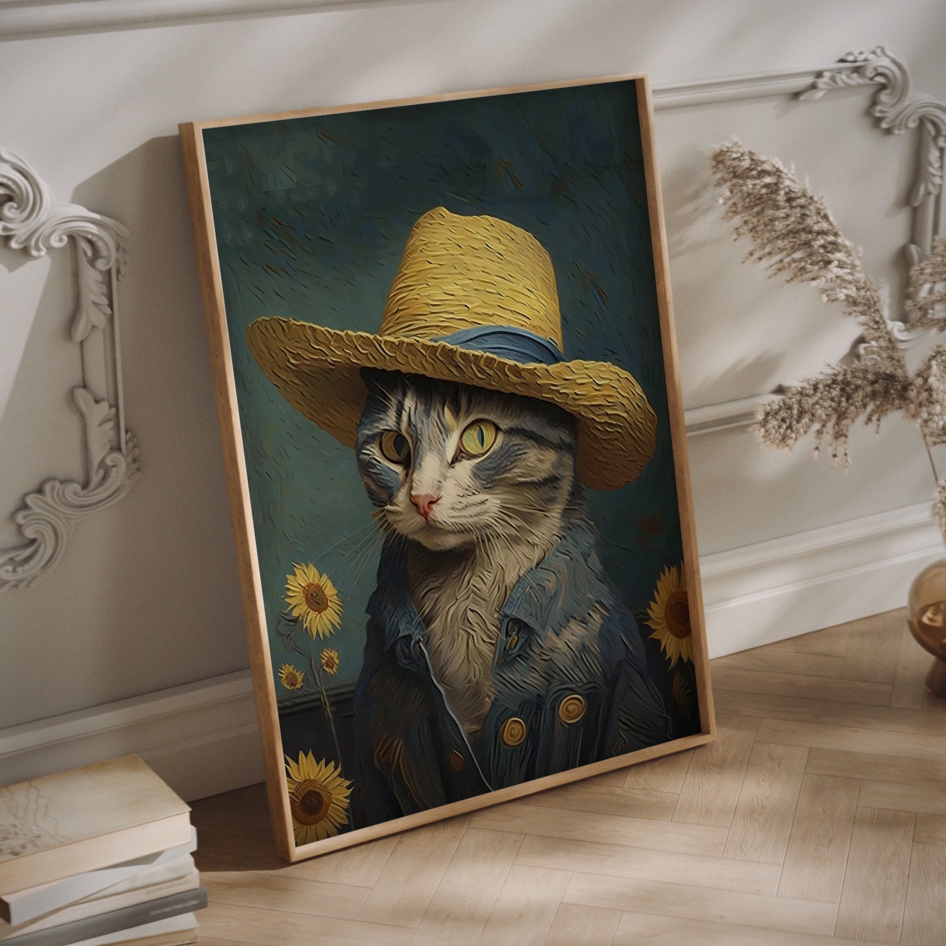 Indulge in the delightful playfulness of this print, reimagining Vincent Van Gogh's "Self-portrait with a straw hat" with the addition of a charming grey cat striking a pose and wearing a jaunty straw hat.
