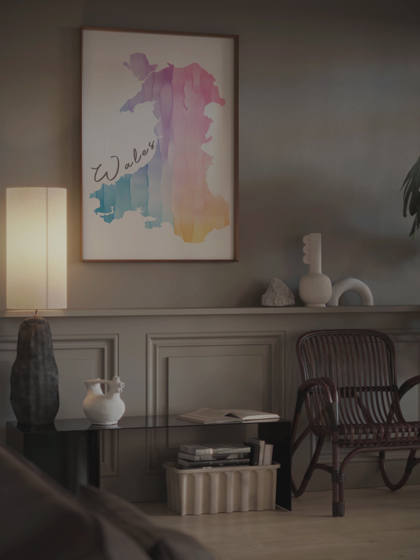 Each stroke of the brush brings to life the rich history and cultural tapestry of Wales, making it a perfect addition to any space that celebrates the magic and allure of this unique corner of the world. Whether you have a deep connection to Wales or simply appreciate the artistry of map illustrations, this print is a captivating tribute to the scenic wonders that define this extraordinary country.